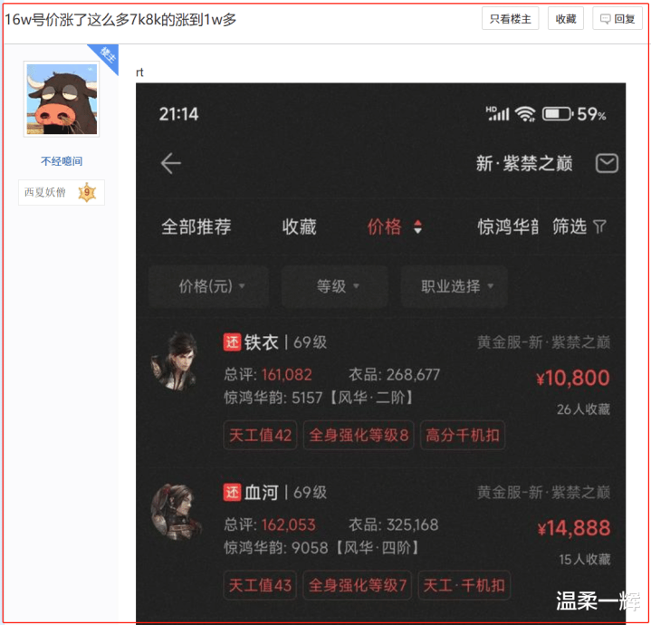 这一消息公布之后,起到了卓著的效果。在游戏七周年资料片上线在即、角色账号即将开启70级之际,藏宝阁的账号价格不降反升,涨幅翻倍。