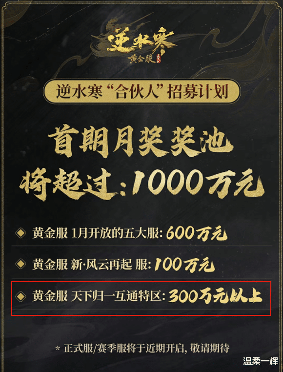根据《逆水寒》官方表示,为了进一步让利于玩家,让玩家们的游戏角色不仅仅提供娱乐价值,还能成为可以“下金蛋”的稳定资产,游戏将面向全体玩家招募合伙人。只要玩家玩游戏玩的足够认真,各种玩法模式的参与度够高,就能积累足够的“月奖积分”,每个月领取月奖奖金。